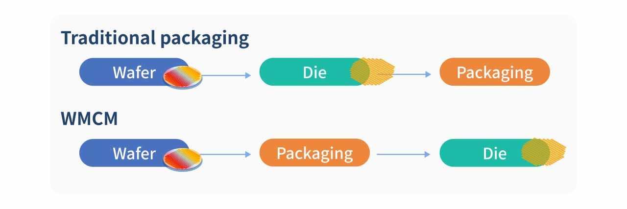 Overall, WMCM increases the number of integrated chips while simplifying the process by eliminating substrates and relying on RDL. This results in improvements in package size, thickness, thermal performance, and signal loss. It can effectively enhance battery life in mobile devices, and by removing substrate requirements, it also offers a lower cost structure compared to other advanced packaging technologies. These advantages make WMCM essential for space-constrained products such as smartphones and communication chips.